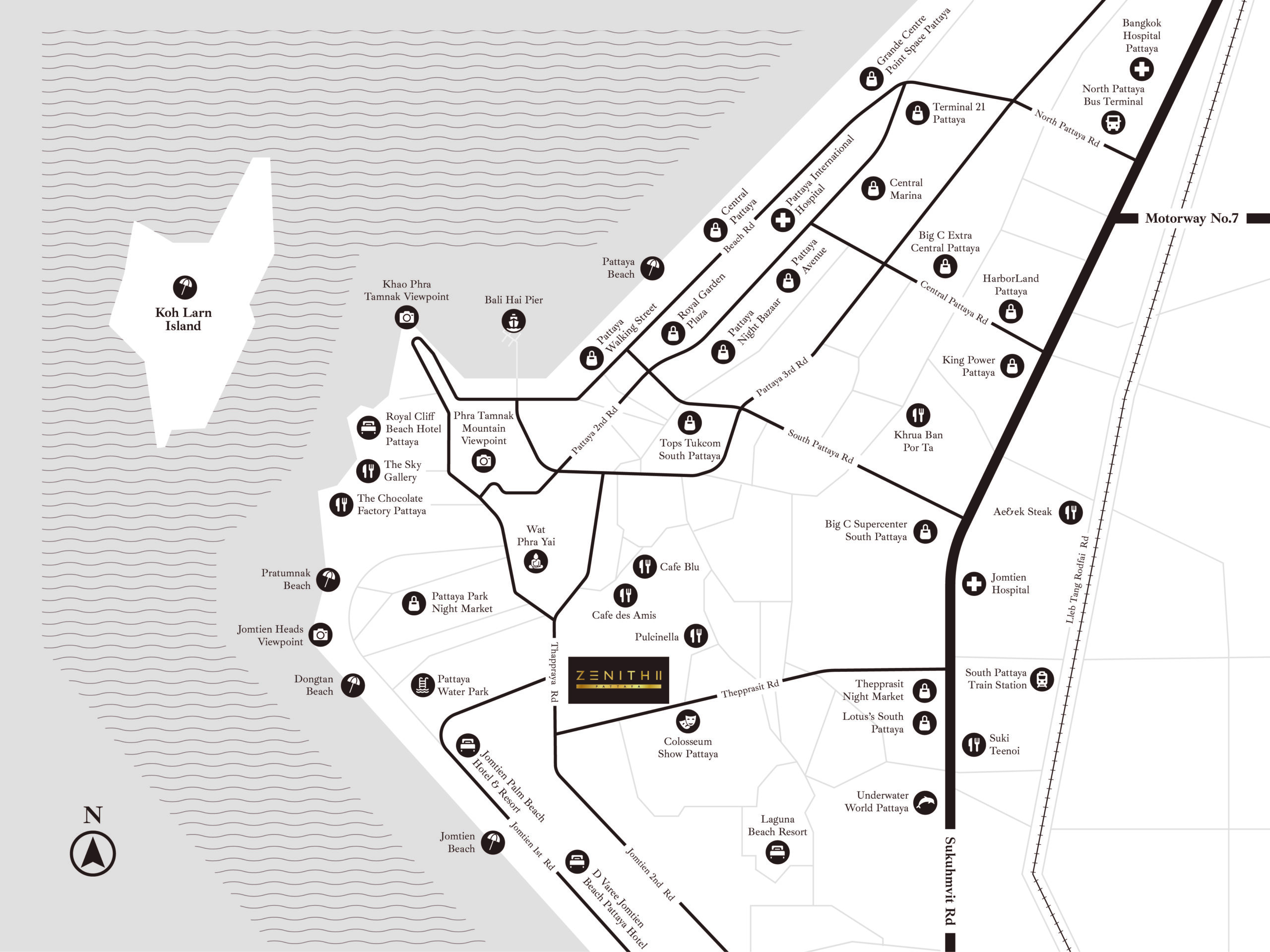 - Prime central location between Pattaya Bay, Jomtien Beach & Pratumnak Hill