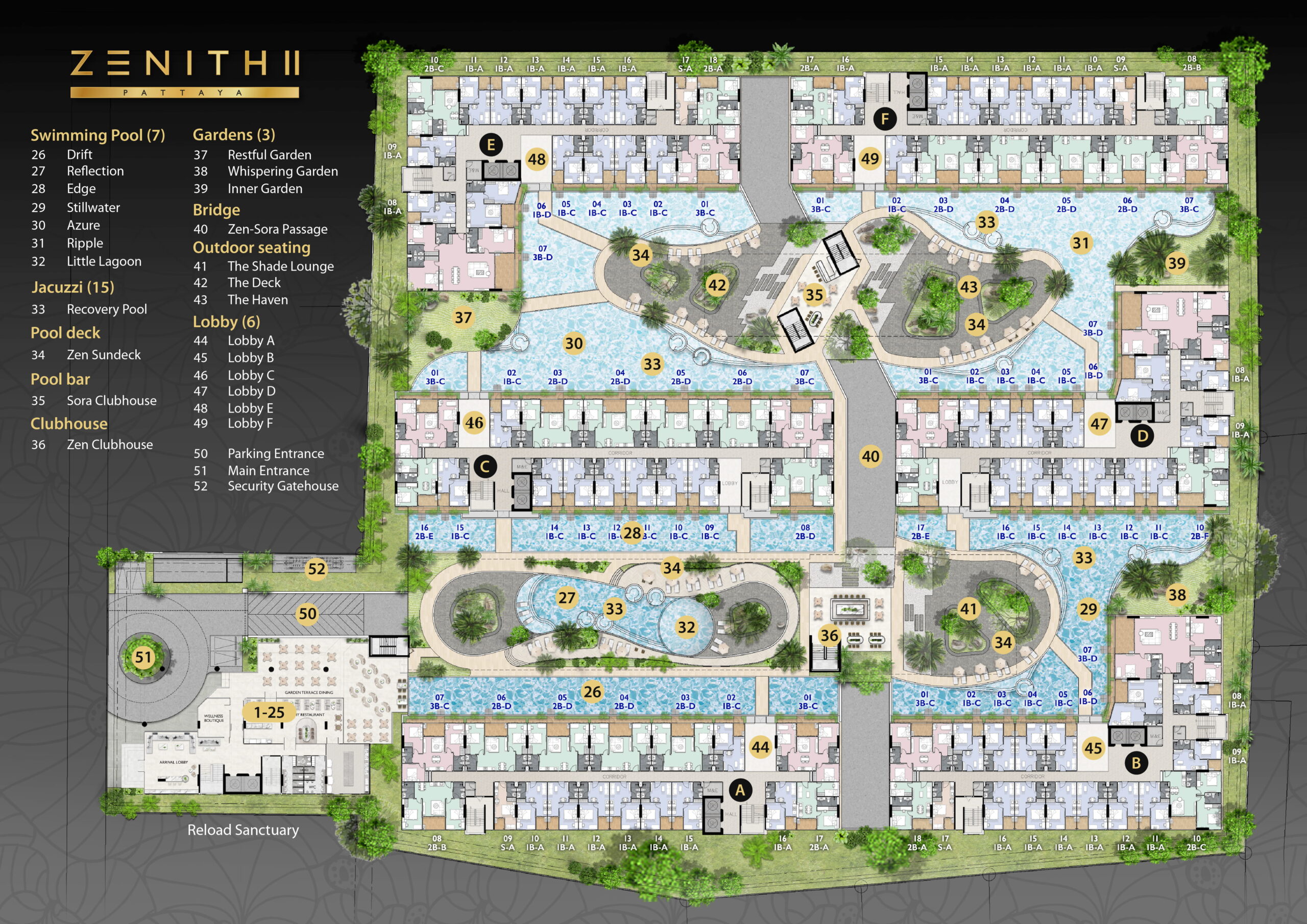 At its heart lies a signature collection of wellness, recovery, and lifestyle amenities designed to restore the body, relax the mind, and elevate everyday living. Vast, sculpted swimming pools weave through Japanese gardens, creating the tranquil, resort-style atmosphere that has become synonymous with the Zenith Pattaya brand.